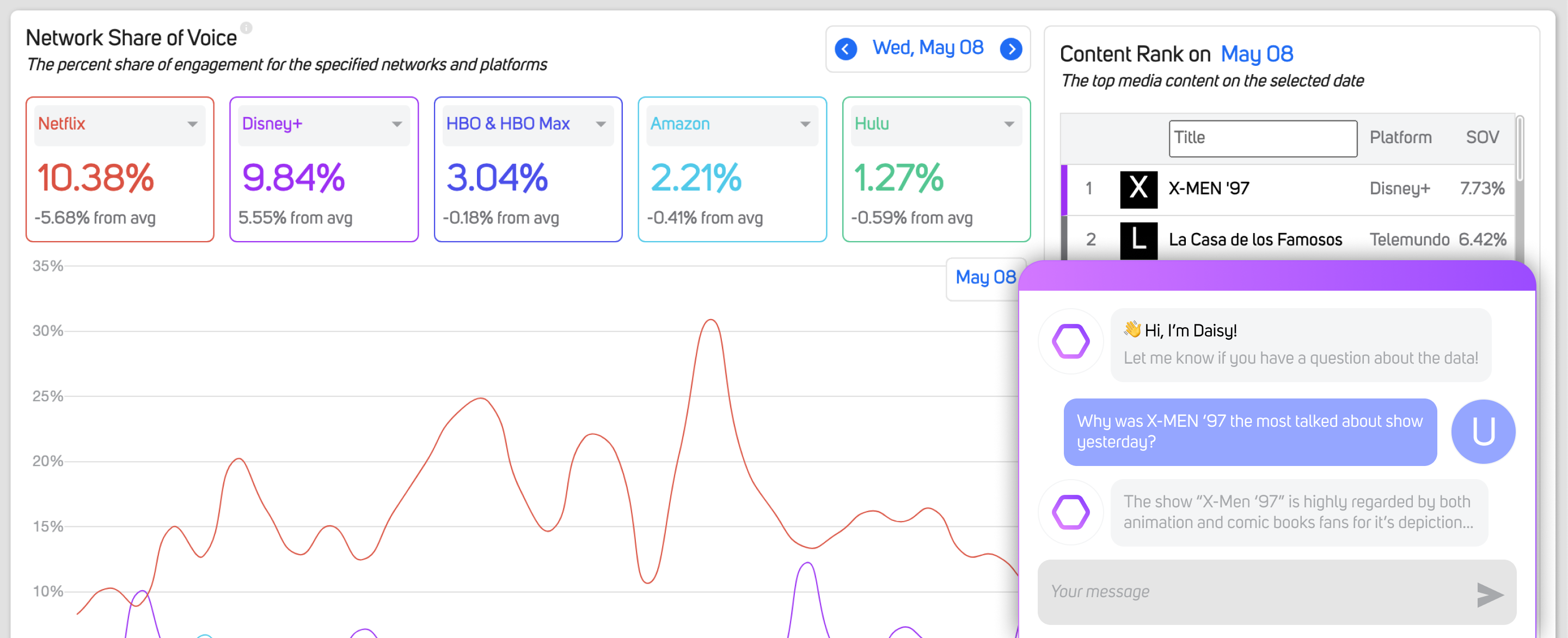 In addition to this rich qualitative capability, we’ve also layered in all of Diesel’s quantitative knowledge, so our AI sidekick can now also answer questions like “what were the top 10 engaged with titles yesterday”, “how many engagements did Rebel Moon – Part 2: The Scargiver achieve yesterday” and even “what was Amazon’s content share of voice last week”.