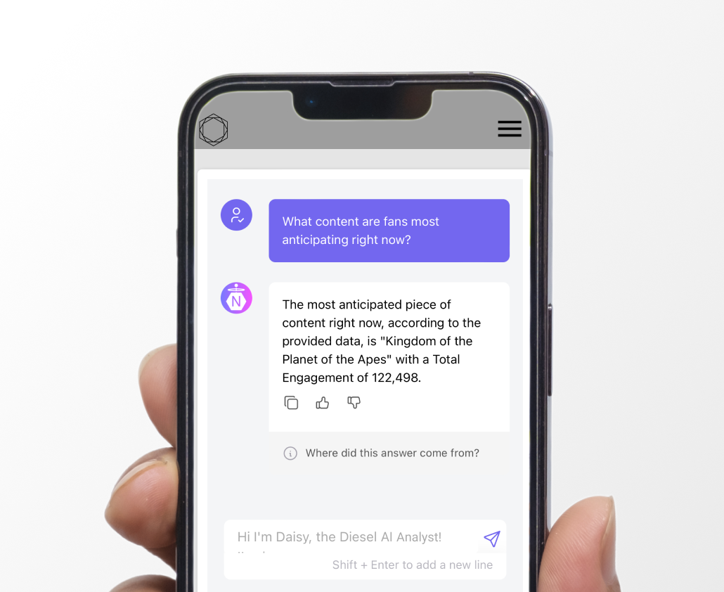 Diesel’s AI sidekick (Daisy!) is a fusion of chatGPT with our vast array of real-time audience data, able to answer nearly any question about content engagement. From “what were the most popular pieces of content yesterday” to “what are people going to watch tonight” and “what did everyone think about the last episode of Doctor Who” – it’s all at your fingertips. Instant access to query what people are saying about content and why, on the fly!