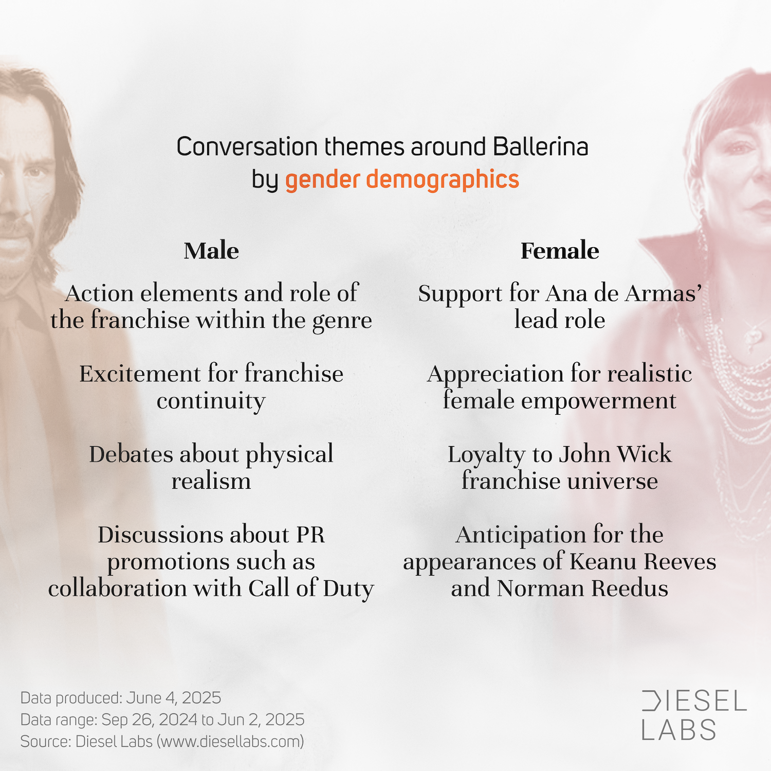 In addition we took a look at discourse around the film, and some key themes that emerged around the assassin spinoff. Men discussed the action adventure genre and physical realism of the film while women leaned toward empowerment and representation.