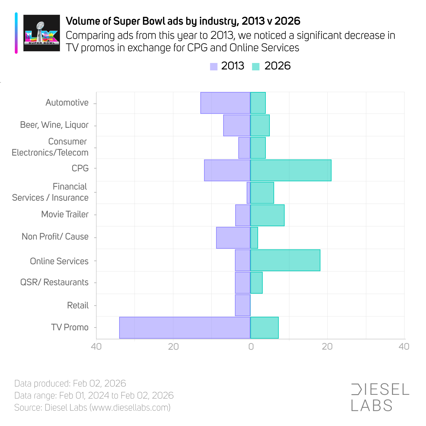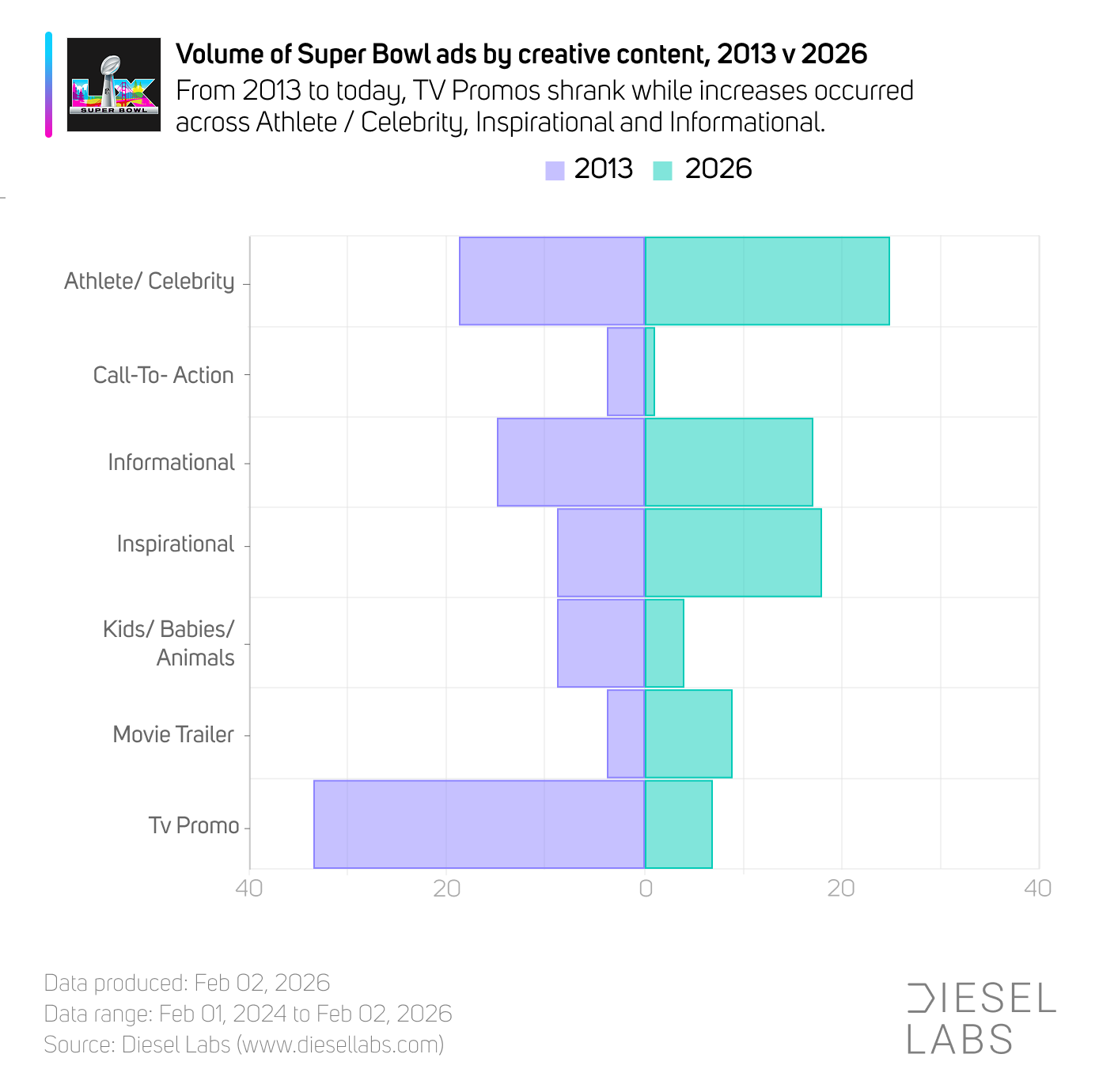 Compared to the breakdown from the 2013 telecast, Automotive ads were down (-8.8%) while CPG (13.3%) and Online Services ads (+18.0%) were up significantly. From a creative perspective, there were more inspirational (+12.7%) and celebrity / athlete (+10.7%) spots in 2026.